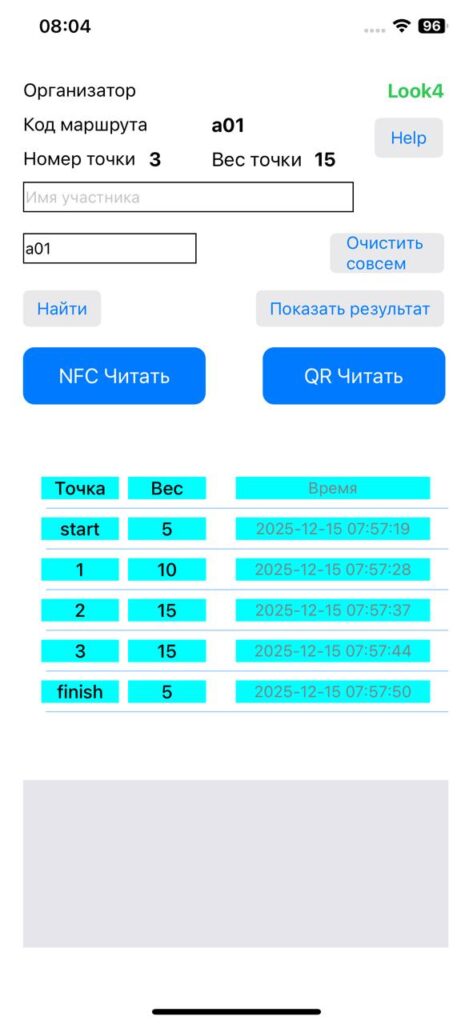 - Приложение Участника соревнований, очень простое, достаточно коснуться телефоном с открытым приложением Точки. Точка будет считана и поместиться в сводную таблицу. Одновременно считаются балы и время. Обязательно отмечаются точки с названиями «start» и «finish» в начале и конце забега. По этим точкам фиксируется общее время прохождения маршрута. По окончанию забега и фиксации «finish», результат передается на Мастер Приложение. Для этого нужно вписать свое имя и нажать кнопку. Отобразиться QR код, который счтывает Организатор соревнований на свое Мастер Приложение. Если собраных Точек больше 10, то результат отдается на Мастер Приложение несколькими страницами. Для удаления всех данных нужно заполнить номер маршрута. Важно: Не рекомендуется удалять данные до окончания подведения итогов соревнований!